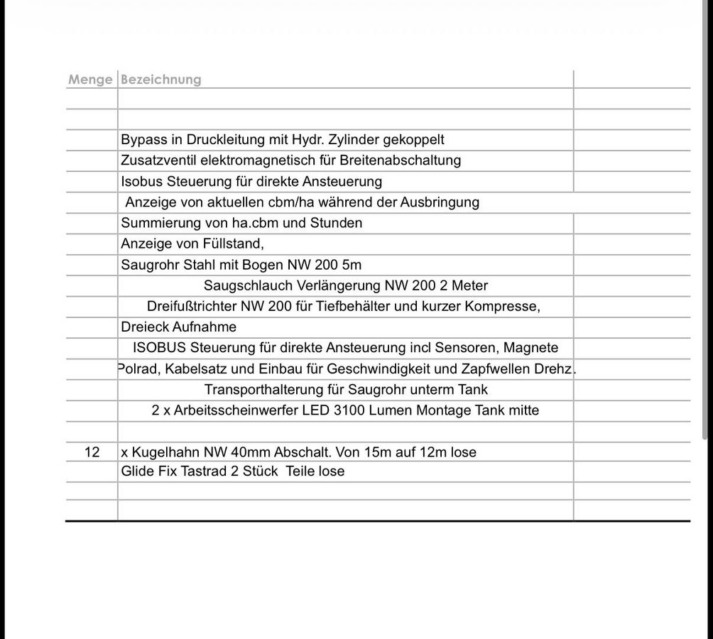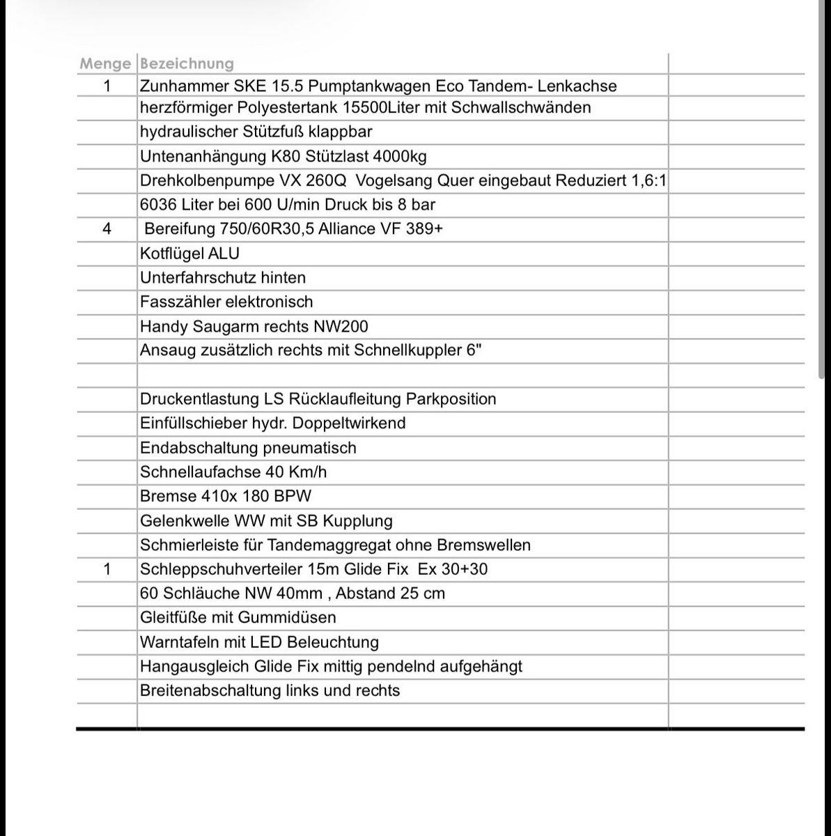 Drehkolbenpumpe Vogelsang VX 260Q Quer eingebaut 6036 Liter bei 600U/min Bereifung 750/60R 30,5 Kotflügel ALU Faßzähler elektronisch Handy Saugarm rechts NW 200 8“ Ansaugung zusätzlich rechts mit Schnellkuppler Saugleitung 4,5m + 2m Schlauch NW 159 6“ Bremse 410 x 180 BPW Schleppschuhverteiler 15m Glide Fix Breitenabschaltung links und rechts hydr. Bypass in Druckleitung Hangausgleich Glide Fix mittig pendelnd aufgehängt IsoBus Steuerung für direkte Ansteuerung Anzeige von aktuellen cbm/ha während der Ausbringung Summierung von ha und Stunden, Anzeige Füllstand Einfüllschieber für Dom doppeltwirkend Nachlauflenkachse Saugleitung 200er 4,5m + 2m mit Dreifußtrichter Load Sensing Untenanhängung K 80 mit 4000kg Stützlast Faß hat ca 14000 cbm ausgebracht. Ersteinsatz 2023Kontaktdaten: