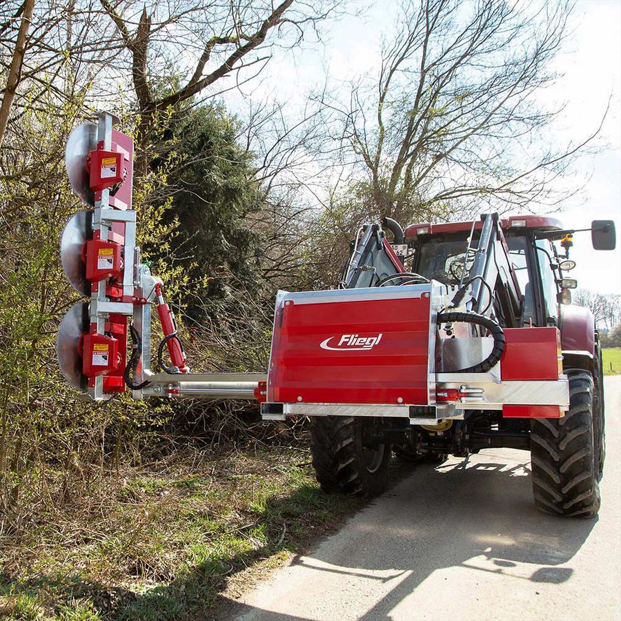 Astsäge »WoodKing Wild« Euronormaufnahme / 3-Blatt / links-rechts Die Fliegl Astsäge ohne Hochleistungskeilriemen – die »WoodKing Wild« bezieht die Energie für die einzelnen Sägeblätter aus separaten Ölmotoren mit geschlossenem Ölbadgetriebe. Diese sind unverwüstlich, wartungsfrei und bieten eine integrierte Überlastsicherung gegen Getriebeschäden. Die verschleißarmen Motore machen das Gerät besonders wartungsarm. Durch den Verzicht auf Hochleistungskeilriemen verringern sich auch Gewicht und Maße! Das gesamte »Wild« Komplettpaket ist gezielt auf die professionelle Forstarbeit ausgelegt. Der Sägekopf besteht aus einem stabilen Grundrahmen, welcher den besonders anspruchsvollen Arbeitsalltag dank seiner langen Lebensdauer problemlos übersteht. Drei hartmetallbestückte Spezial-Sägeblätter mit 700 mm Durchmesser und je 60 widiabestückten Zähnen ermöglichen eine effektive Arbeitsbreite von ca. 2100 mm. Sie sorgen für einen sauberen und glatten Schnitt auch bei dicken Ästen bis zu einem Durchmesser von ca. 280 mm. Diese sorgfältige Arbeitsweise kann einen Krankheitsbefall vorbeugen und die schnelle Heilung der Schnittfläche begünstigen. Die Sägeblätter erreichen dabei eine hervorragende Arbeitsgeschwindigkeit für ein besonders sauberes Schnittergebnis. Auf der Astsägen Ober- und Unterseite verhindern widerstandsfähige Schutzbügel die Berührung der Sägeblätter mit dem Erdreich und dienen zum Schutz in jeder Anbauposition. Der in einem Neigungswinkel von 111° stufenlos verstellbare Sägekopf ist beweglich auf einem um 1200 mm seitlich ausschiebbaren Ausleger platziert. Somit kann am Straßenrand gefahren und im Auslegerbereich geschnitten werden. Selbst im voll ausgefahrenen Zustand sorgt das serienmäßige, seitliche Kontergewicht für eine gute Balance und verringerte Belastung der Schwinge. Features » Sauberer Schnitt von dünnen und dicken Ästen » Flacher, speziell geformter Sägekopf für beste Sicht – ideal zum Schneiden von Sträuchern oder grobem Gestrüpp geeignet » Schnelles Freischneiden von Straßen und Wegen » Kompakte Bauform » Geringer Wartungsbedarf » Serienmäßig mit Schutzbügel – Schutz vor Beschädigung bei bodennahen Arbeiten » Ausleger seitlich um 1200 mm ausschiebbar – ermöglicht Fahren am Straßenrand und Schneiden im Auslegerbereich » Beidseitige Aufnahme für Links- und Rechtsanbau » Serienmäßig mit seitlichem Kontergewicht – keine einseitige Belastung der Schwinge des Trägerfahrzeugs und geringere Kippgefahr » Serienmäßig mit Steuerblock zum gleichzeitigen Bedienen aller Funktionen: Integrierter Drucksensor überträgt bei zu hohem Öldruck akkustisches Signal in die Fahrerkabine und warnt vor einem Blockieren der Sägeblätter » Serienmäßig mit Neigevorrichtung 111° – Schnittwinkel stufenlos einstellbar Technische Details » Arbeitsgeschwindigkeit: bis ca. 8 km/h » Aststärke: bis ca. Ø 280 mm » Schnittbreite: 2100 mm » 3 Sägeblätter (Ø 700 mm) aus hochverschleißfestem Stahl mit 60 Widia bestückten Zähnen » Antrieb über Ölmotore mit geschlossenem Ölbadgetriebe » Erforderliche Ölmenge: ca. 75 l/min – hohe Kraftübertragung » Astsägenkopf um 180° schwenkbar » 1 doppeltwirkender Anschluss erforderlich » Eigengewicht: ca. 900 kgKontaktdaten: