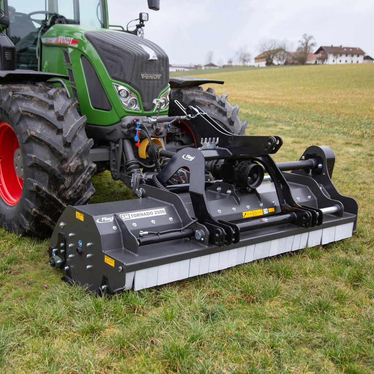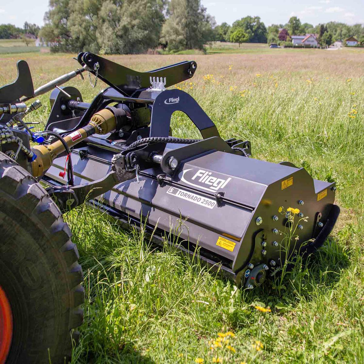 Schlegelmulcher »Tornado« Arbeitsbreite 2500 mm / Dreipunktaufnahme Kat. 2 / mit Drehzahl 1000 U/min Die neuen Schlegelmulcher »Tornado« aus dem Fliegl Agro-Center sind bereit für den anspruchsvollen Einsatz. Diese große Mulcher-Baureihe ist besonders robust gefertigt und folgt höchsten Qualitätsstandards. Damit wird das großflächige Schneiden von Gras, das Zerkleinern von Trieben und Stielen und das Beschneiden von Schnittresten noch effizienter. Serienmäßig bestehen die Schlegelmulcher aus einem gut verarbeiteten, lackierten Gehäuse mit besonders zuverlässigen Innenkomponenten. Die selbstreinigende, verstellbare Nivellierwalze sowie die feingewuchtete Schlegelwelle sind mit langlebigen Flanschlagern ausgestattet, die dank den leicht zugänglichen Schmiernippeln problemlos zu warten sind. Die seitlichen Gleitkufen sind ebenfalls höhenverstellbar und geben in Verbindung mit der Nivellierwalze die Schnitthöhe vor. Die Lagerung ist so ausgeführt, dass das Mähgut nicht wickeln kann und der Mulch direkt abgelegt und festgewalzt wird. Features » Getriebe mit Freilaufkupplung » Hydraulische Seitenverschiebung: 400 mm, selbstschmierend gelagert Technische Details » Dreipunktaufnahme Kat. 2 » Arbeitsbreite: 2500 mm » Gesamtbreite: ca. 2720 mm » Front- und Heckanbau » Hochleistungskeilriemen: 5 » Verstärkte Nachlaufwalze 194 mm » Rotorwalzendurchmesser: 194 mm » Hammerschlegel: 27 Stück (1,32 kg/Stück) » Kraftbedarf: ca. 80 PS » Erforderliche Drehzahl: 1000 U/min » Gewicht pro Schlegel: 1,32 kg » Inkl. Glenkwelle » Inkl. Zusatzverschleißblech » Heckklappe aufstellbar für optimierten Materialfluss » Selbstreinigung der Nachlaufwalze » 2 Kontramesserreihen + Gegenschneide für fein zerkleinertes Mulchgut » Gleitkufe / Nachlaufwalze in der Höhe verstellbar » Einzelgewicht: ca. 855 kgKontaktdaten:
